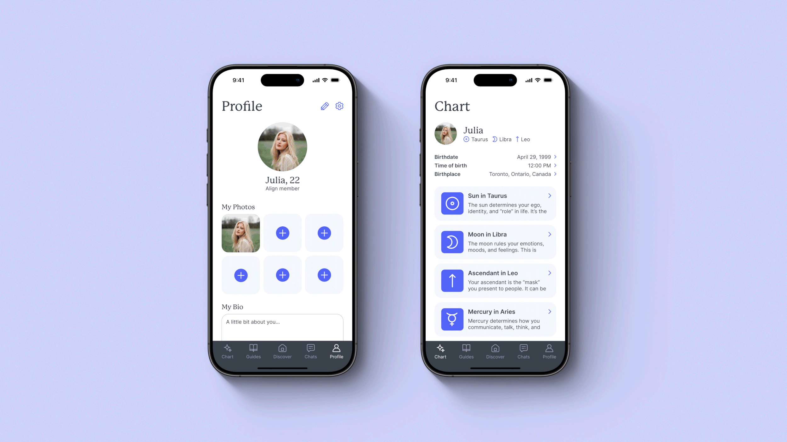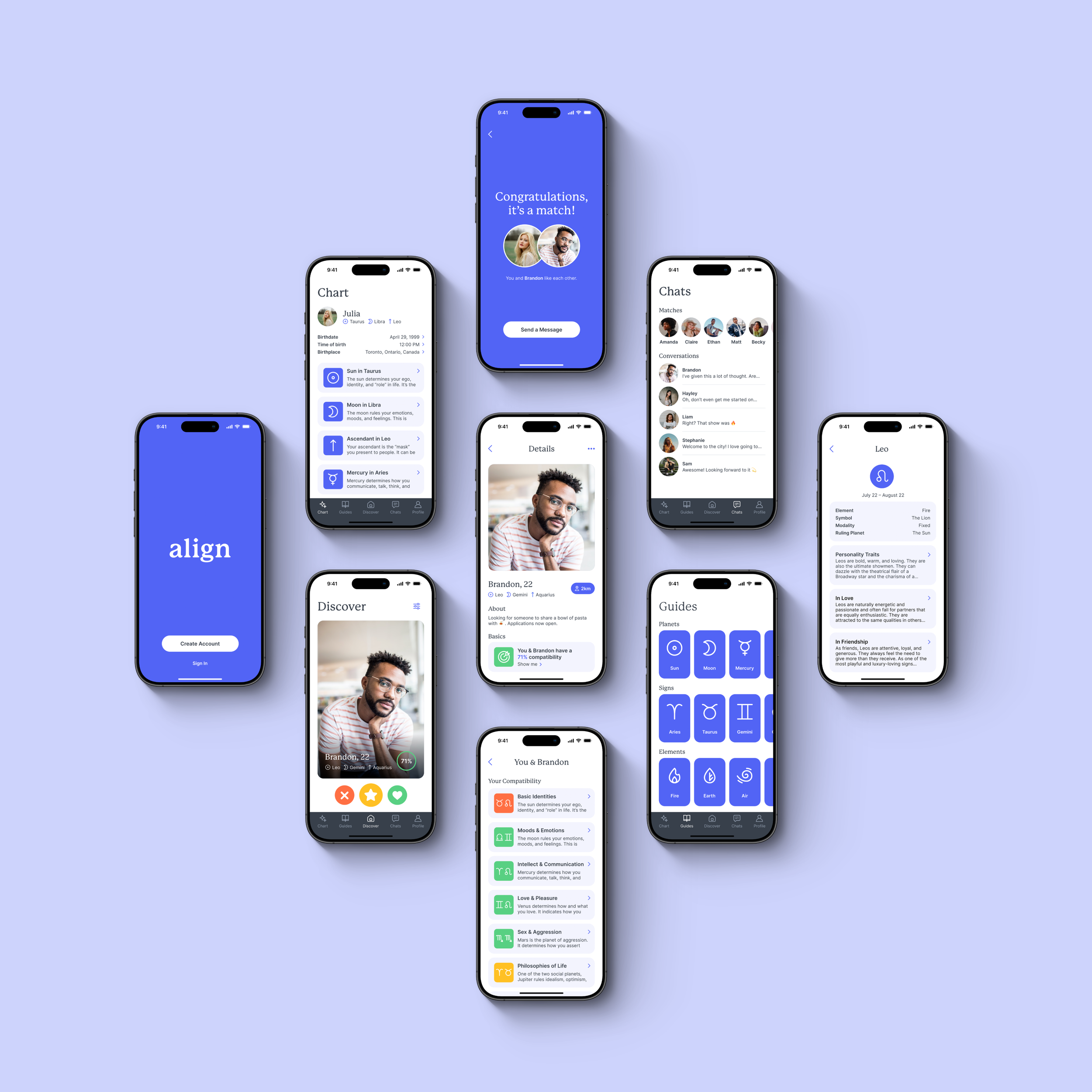 Align is an astrology dating app that matches users based on their astrological compatibility, adding a new dimension to the traditional swipe algorithm. The app also includes educational guides on astrology’s impact on relationships. The project began with research into existing dating apps, user experiences, and astrology knowledge. This research informed the creation of paper prototypes, which were then developed into low-fidelity wireframes. The final design features a clean, minimal interface with blue accents to enhance usability and appeal.