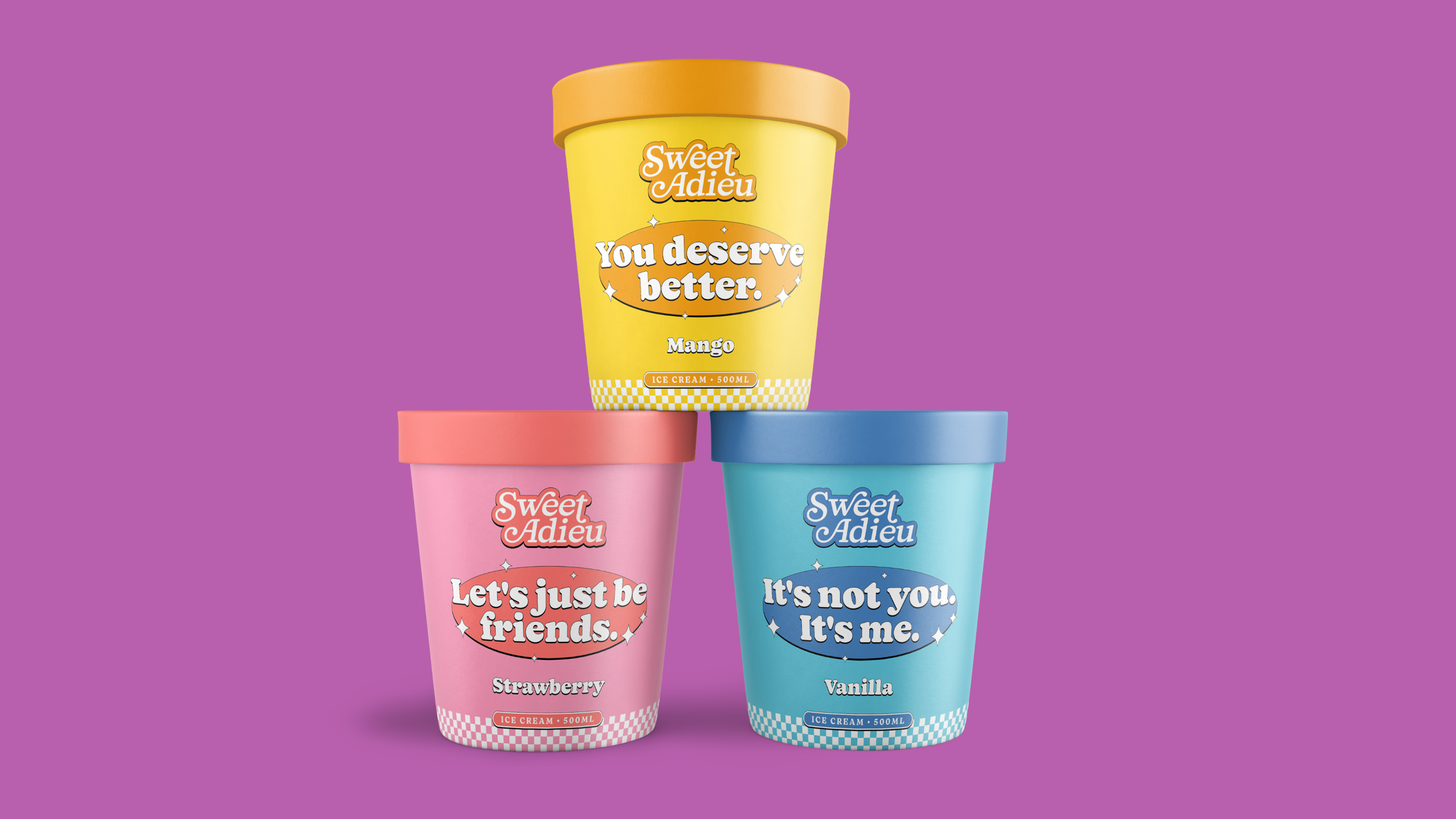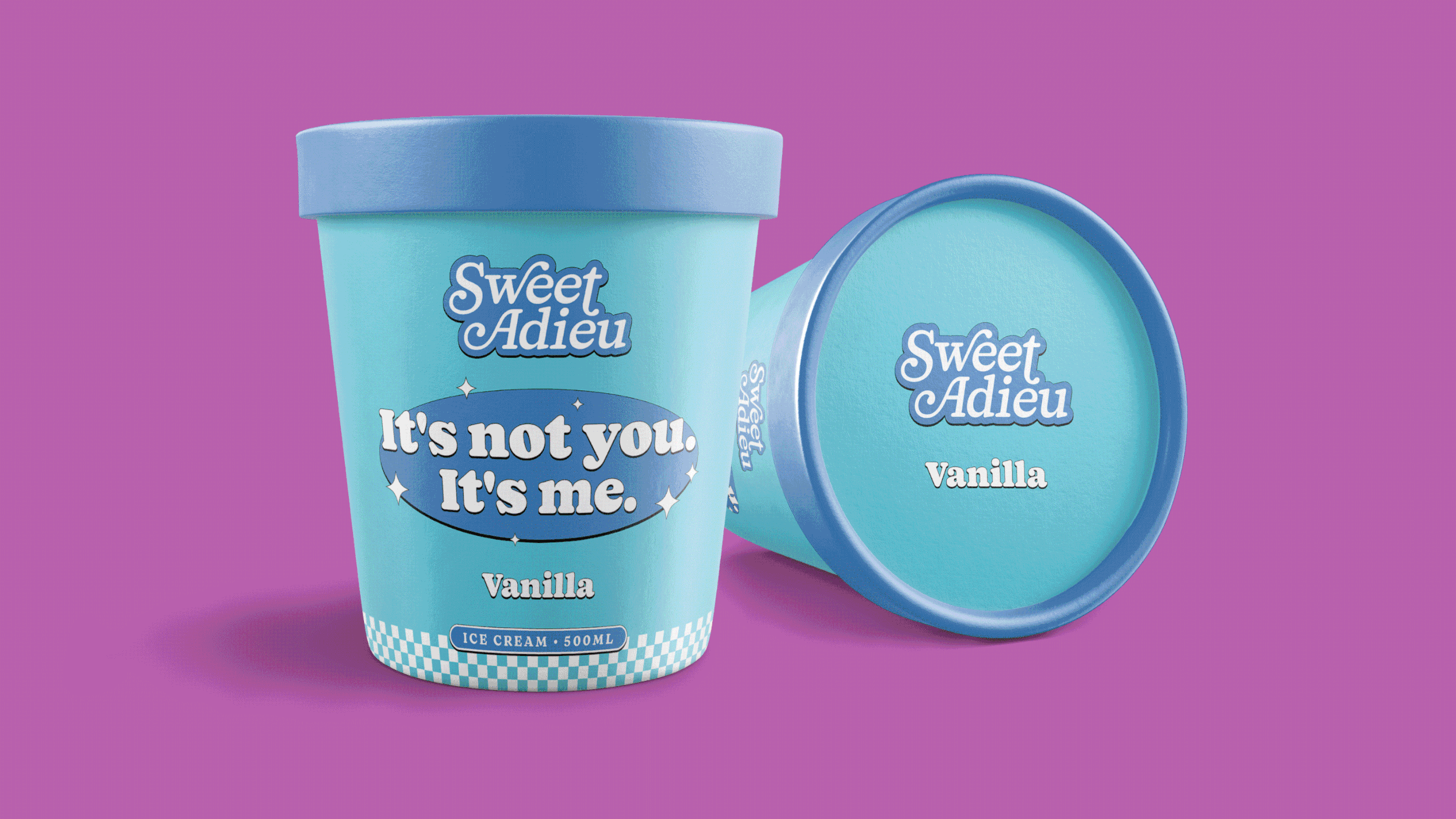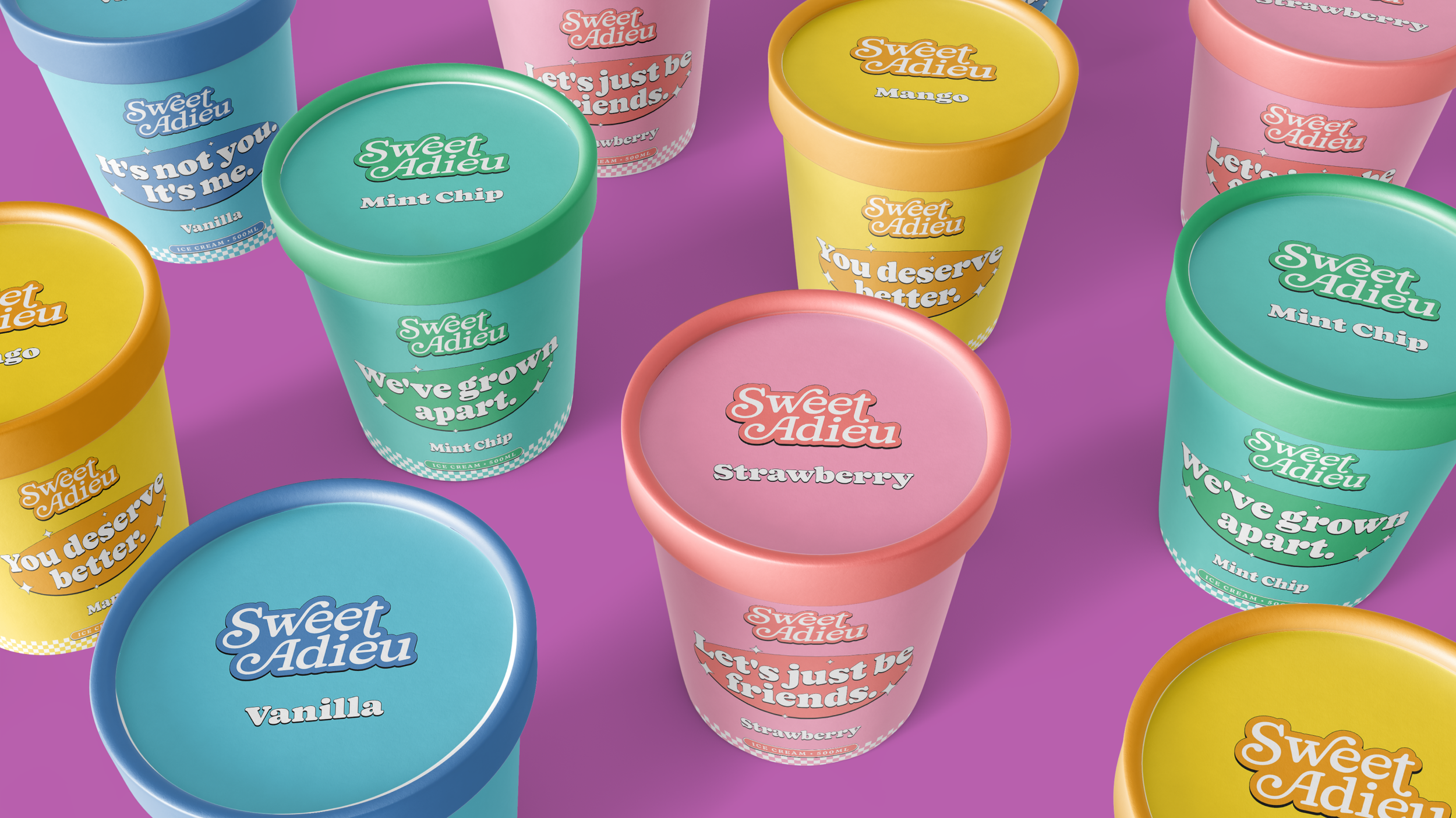 Sweet Adieu focused on creating a fun, memorable identity for an ice cream brand with unique packaging. The brand features break-up themed ice cream pints, offering a light-hearted way to move on from a relationship. Aimed at a younger audience, the playful identity includes a retro-inspired logo and vibrant colors. Packaging designs, featuring break-up phrases, are visually cohesive yet distinct in colour and prompts for easy flavour identification.
