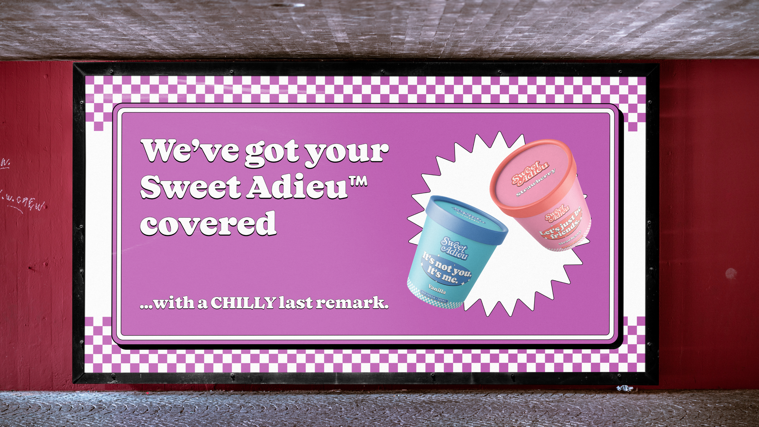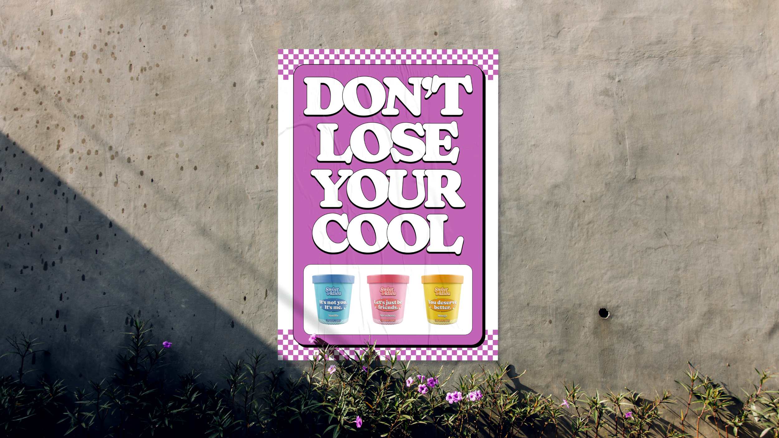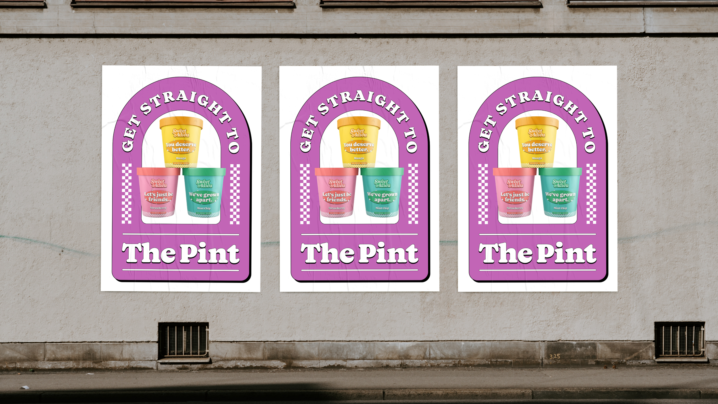 Sweet Adieu focused on creating a fun, memorable identity for an ice cream brand with unique packaging. The brand features break-up themed ice cream pints, offering a light-hearted way to move on from a relationship. Aimed at a younger audience, the playful identity includes a retro-inspired logo and vibrant colors. Packaging designs, featuring break-up phrases, are visually cohesive yet distinct in colour and prompts for easy flavour identification.